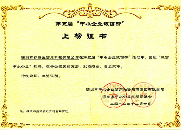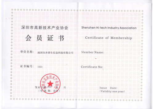 • 深圳市高新技術產業協會會員證書