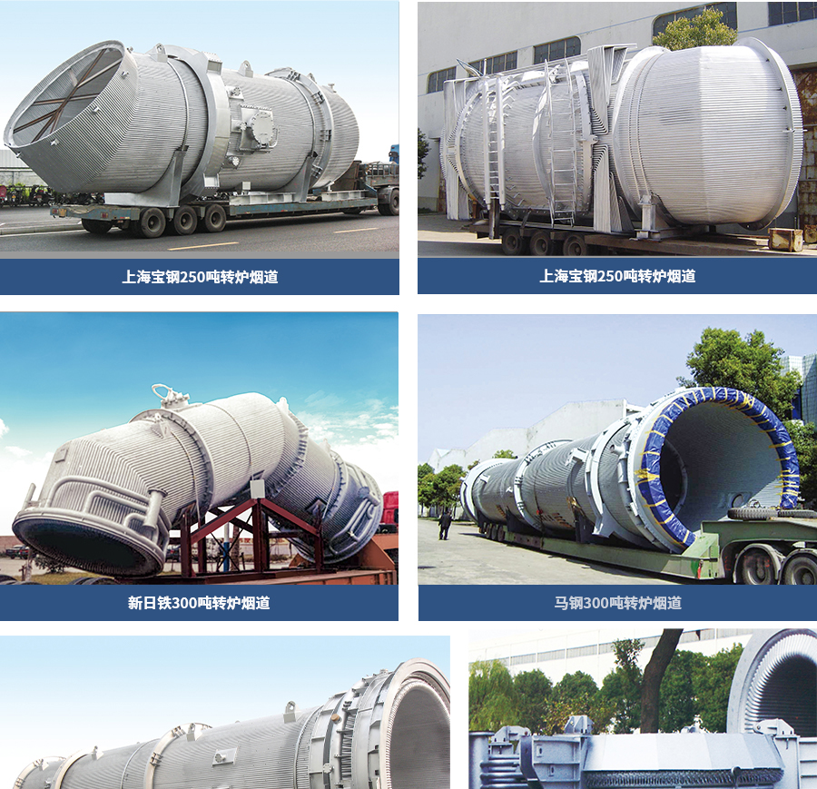 從1990年開始設計制造煉鋼轉爐容量從15噸到300噸轉爐的煙道。煙道壓力從0.8Mpa~4.0Mpa。循環方式一般為:容量80噸轉爐煙道以下為自然循環,容量80噸轉煙道以上為自然循環+強制循環,業績超過250套;除了滿足國內市場的需要(中國市場占有率80%以上)同時出口到韓國(浦項,現代),美國(美鋼聯)等。 項目實景