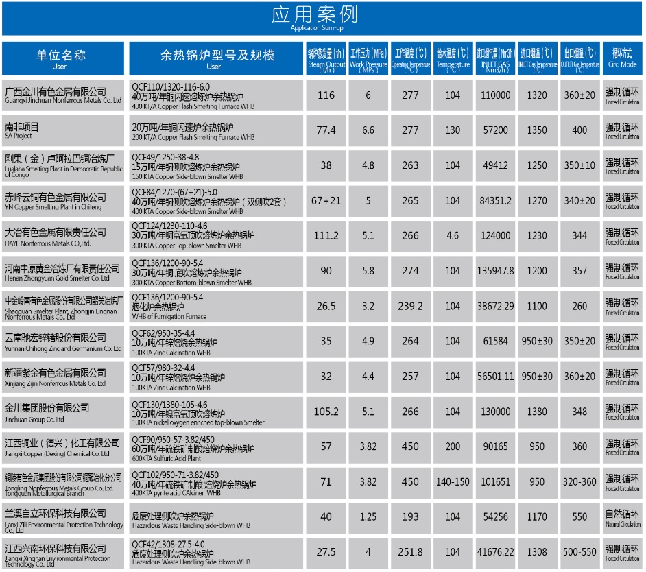 The waste heat boilers designed, manufactured and erected by our company serve major non-ferrous smelting enterprises at home and abroad, such as Jinchuan Group, Zijin Mining, Jiangxi Copper, China Copper, Yunnan Tin, Chihong Zinc and Germanium, etc., accounting for more than 90% of the non-ferrous market. Through years of painstaking research on waste heat boilers such as copper smelting (flash furnaces, side-blown furnaces, bottom-blown furnace, copper oxygen rich top-blown furnaces, Osmet furnaces, Isa furnaces, etc.), tin smelting (Osmet furnace waste heat boilers), lead and zinc smelting (Kifset furnaces, side-blown furnaces, bottom blown furnaces, fumigation furnaces, reduction furnaces, roasting furnaces, rotary kiln waste heat boilers) considering all kinds of smelting process characteristics, based on the characteristics of large dust content of flue gas, strong adhesion, strong corrosiveness and large fluctuation of flue gas cycle, the corresponding furnace type has been developed by our R&D team. With high technical content and reliable operation, it has gained high recognition and trust from customers at home and abroad.