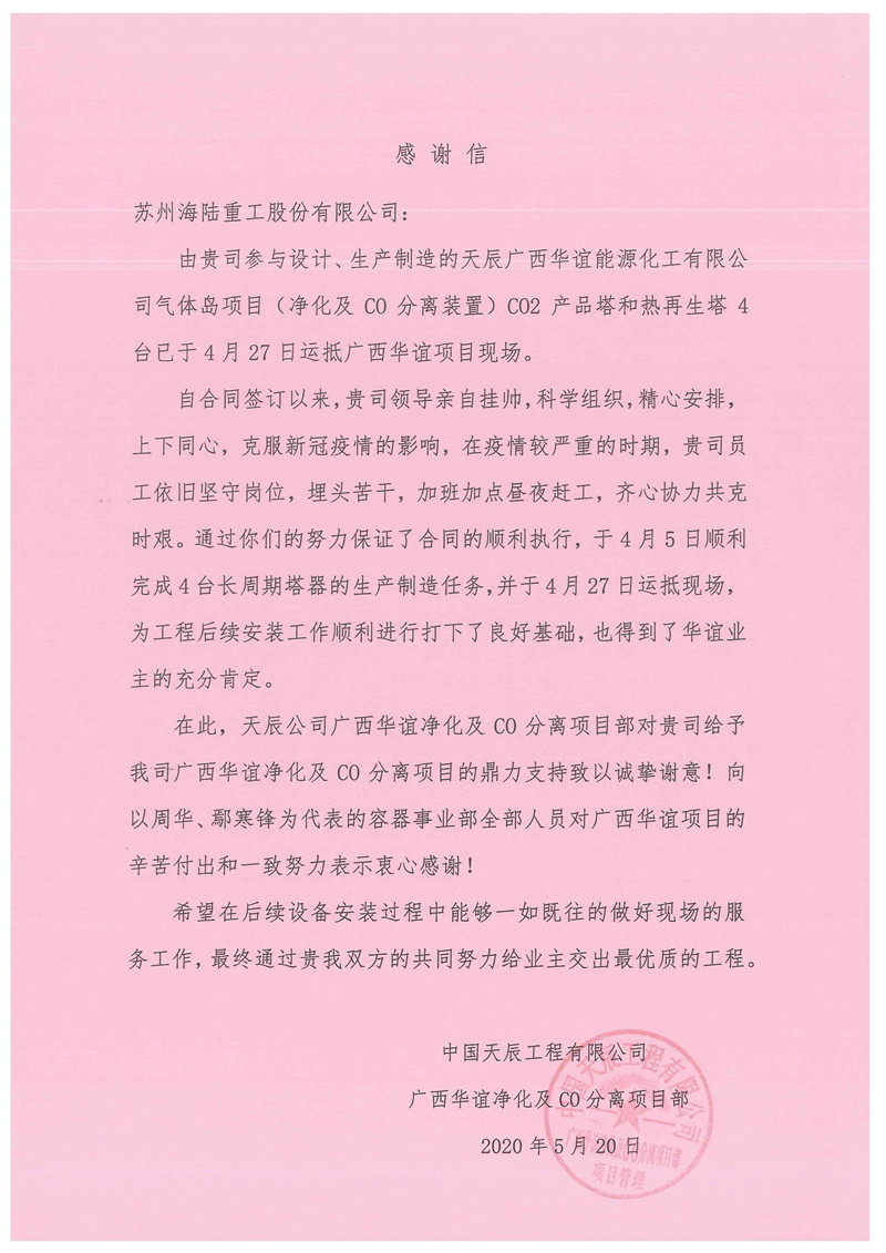 編后語:收到客戶的感謝信,我們的心中十分的激動,但小編還是要向每一位尊貴的客戶說一句:“這是我們應該做的,謝謝你們這么多年對我們海陸的關心和支持,我們海陸一定會做的更好?!?br /> 海陸重工作為國內一流的節能環保設備專業設計制造企業,產品覆蓋鍋爐、壓力容器、核電、冶金及環保工程等多個產品領域,秉承“科技領航 業界先鋒”的理念,順應時代發展,致力于為實現國家節能環保的戰略目標做出更大貢獻。